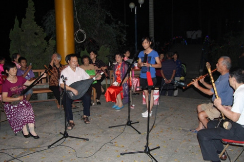 在金川前的小廣場上,文藝晚會(huì)依舊豐富多彩,激情動(dòng)感的舞蹈、詼諧幽默的小品、悠揚(yáng)美妙的器樂彈唱贏來了一波又一波的掌聲和笑聲。而在秋中湖旁的小涼亭里,有支特別的樂隊(duì)也吸引了不少老師學(xué)生駐足聆聽,他們是由華僑大學(xué)退休教職工組成的南音演奏社。老人家們彈著琵琶,吹著筒蕭,拉著二弦三弦,吟唱一首又一首韻味悠長的南音樂曲。來自橋南小學(xué)的幾名學(xué)生也來助陣,老少合作的表演別樣溫馨。今年已經(jīng)七十一歲的張彬彬女士表示,他們同是喜愛南音的老職工,她退休以來已經(jīng)學(xué)了七八年的南音了,能把南音這一傳統(tǒng)文化傳播給更多人,他們都很開心。