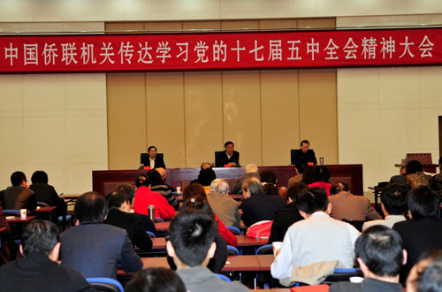 中新網(wǎng)10月20日電 據(jù)中國僑聯(lián)網(wǎng)消息,10月19日上午,中國僑聯(lián)機關(guān)召開傳達學(xué)習(xí)黨的十七屆五中全會精神大會。中國僑聯(lián)在京顧問、僑聯(lián)機關(guān)、直屬企事業(yè)單位、離退休全體黨員參加了會議。中國僑聯(lián)主席林軍介紹了參加十七屆五中全會的情況并傳達了中共中央總書記胡錦濤在全會上的兩次講話和國務(wù)院總理溫家寶就《中共中央關(guān)于制定國民經(jīng)濟和社會發(fā)展第十二個五年規(guī)劃的建議》所作的說明。中國僑聯(lián)副主席董中原主持會議,副主席喬衛(wèi)出席會議。