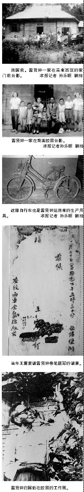 當(dāng)年10月,以僑領(lǐng)莊明理為團(tuán)長(zhǎng)的全國(guó)僑聯(lián)慰問(wèn)團(tuán),前來(lái)慰問(wèn)愛(ài)國(guó)華僑雷賢鐘一家,于是留下這張珍貴的歷史記憶:老老少少幾十人中,有雷賢鐘一家,有慰問(wèn)團(tuán)成員,還有橡膠園工人和當(dāng)?shù)剞r(nóng)民。