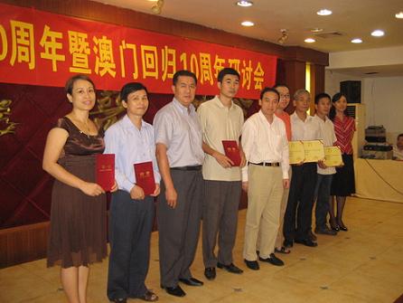 10月14日下午,廣東省江門市僑聯(lián)、江門市華僑歷史學會在市僑聯(lián)大廈舉行以“慶祝建國60周年暨澳門回歸10周年”為主題的研討會。江門市政府副市長謝日榮,市外事僑務局局長、僑聯(lián)主席張國富,市社科聯(lián)主席楊偉雄,澳門大學中國文化研究中心主任鄭德華教授等專家學者以及學會理事等50多人出席。研討會由江門市僑聯(lián)專職副主席林春暉主持。