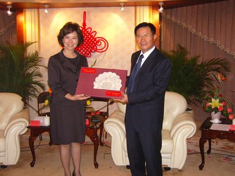 金秋十月的鮀城,山青水秀,風光迷人,給首次蒞汕的趙小蘭女士一行留下美好的印象。10月23日晚,趙小蘭接受汕頭市委副書記鄧大榮、副市長周鎮(zhèn)松等市領導的會見時,稱汕頭是一座美麗的海濱城市,從短短一天的參觀中,可以看出汕頭的工業(yè)非常發(fā)達,環(huán)境保護工作做得非常好,希望汕頭發(fā)展得越來越好。