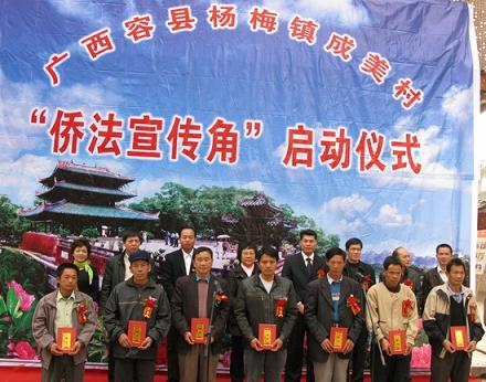 “僑法宣傳角”是國務院僑辦開展“五五”普法、宣傳《中華人民共和國歸僑僑眷保護法》及其實施辦法的一項重要舉措。玉林市外事僑務辦積極推薦并爭取到在楊梅鎮(zhèn)成美村設立“僑法宣傳角”。成美村有人口4000多人,有歸僑僑眷3600多人、海外僑胞4280多人,有僑屬企業(yè)2家。該村黨總支部、村委會辦公設施先進,功能室健全,每天到村辦事、開會、讀報、學技術、娛樂的人員均有百人以上,并重視宣傳僑法、維護歸僑僑眷的合法權益,聘請了27位村民小組長、村民代表為“僑法宣傳角”義務宣傳服務員。在這里設立“僑法宣傳角”,有利于廣泛深入地開展僑法集中宣傳活動,加大僑法宣傳貫徹落實力度,進一步營造愛僑、護僑、惠僑的良好社會環(huán)境。
