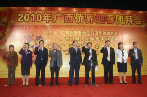 中新網(wǎng)2月20日電 據(jù)廣西僑聯(lián)消息,日前,2010年廣西僑界迎春團(tuán)拜會在南寧市明園飯店隆重召開。本次團(tuán)拜會由廣西自治區(qū)僑聯(lián)、自治區(qū)僑辦主辦,廣西華商會、廣西華僑愛心基金會協(xié)辦。