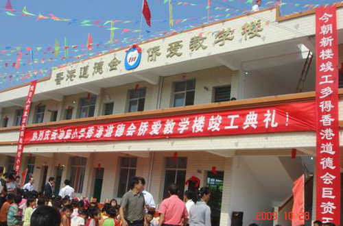 通過廣西自治區(qū)僑辦牽線搭橋,捐助支持廣西各項(xiàng)公益事業(yè)的僑社和慈善團(tuán)體中,香港道德會(huì)較為突出。香港道德會(huì)是香港有名的慈善機(jī)構(gòu),2009年先后在廣西欽州市欽南區(qū)新營(yíng)村、賀州市八步區(qū)東南村、岑溪市地麻村、陸川縣清耳村等地,捐建4所小學(xué),捐贈(zèng)總額達(dá)172萬元人民幣。這些受捐建的小學(xué)有個(gè)響亮的名字:“香港道德會(huì)僑愛教學(xué)樓”。