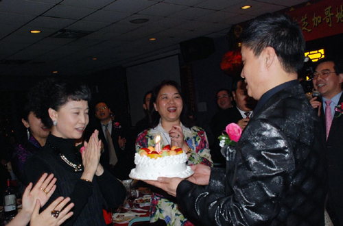 在歡迎宴會上,許又聲在總領(lǐng)事黃屏陪同下,向參加宴會的每一桌僑胞一一敬酒,向大家致以親切問候。來賓們和閻維文、夢鴿、陳軍、劉珂、雷佳、劉小娜等藝術(shù)家們爭相合影,歡聲笑語不斷。當(dāng)天正值閻維文的夫人劉衛(wèi)星生日,大會特地準備了生日蛋糕,全場合唱“祝你生日快樂”。閻維文也清唱一首“在那遙遠的地方”來感謝大家,受到熱烈的歡迎。