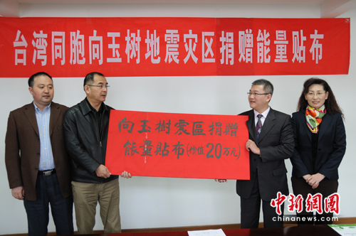 中新網(wǎng)北京4月28日電(記者 張冬冬)臺(tái)灣通德興業(yè)股份公司董事長(zhǎng)陳前芳28日在此間向中國(guó)華僑經(jīng)濟(jì)文化基金會(huì)捐贈(zèng)價(jià)值20萬元人民幣的能量貼布,用以支援青海玉樹抗震救災(zāi)。